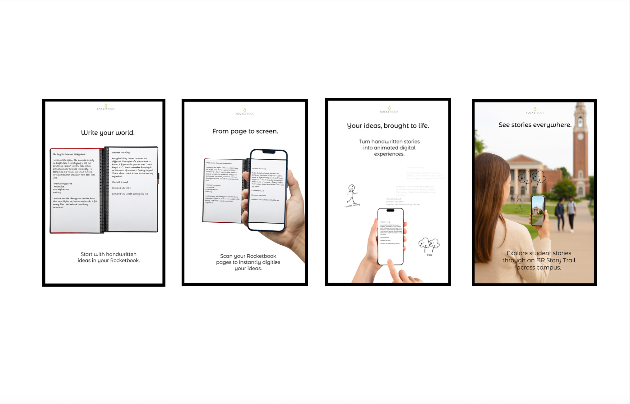 Students scan handwritten stories from Rocketbook notebooks, which are transformed into animated AR experiences displayed across campus, with top entries earning scholarships.